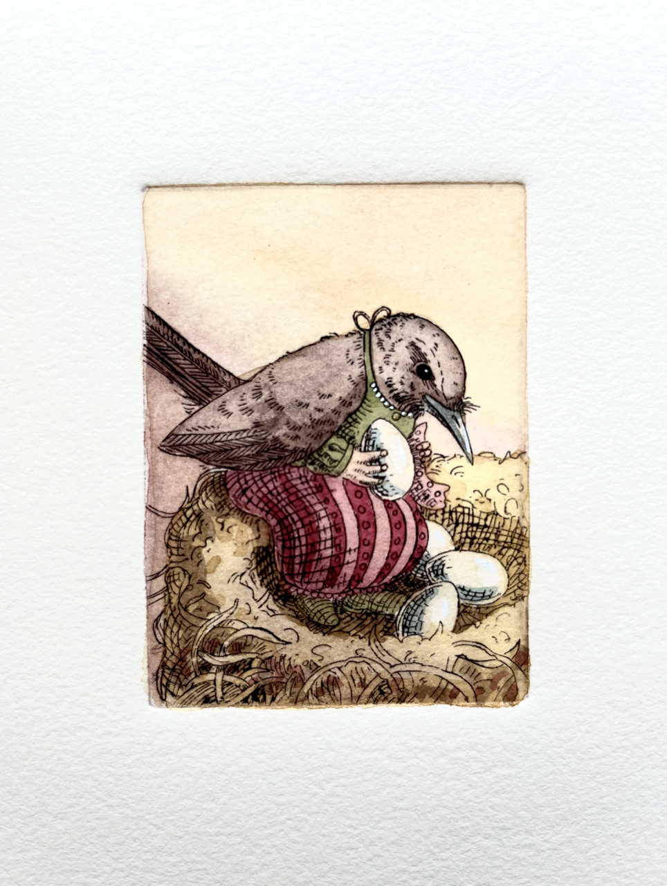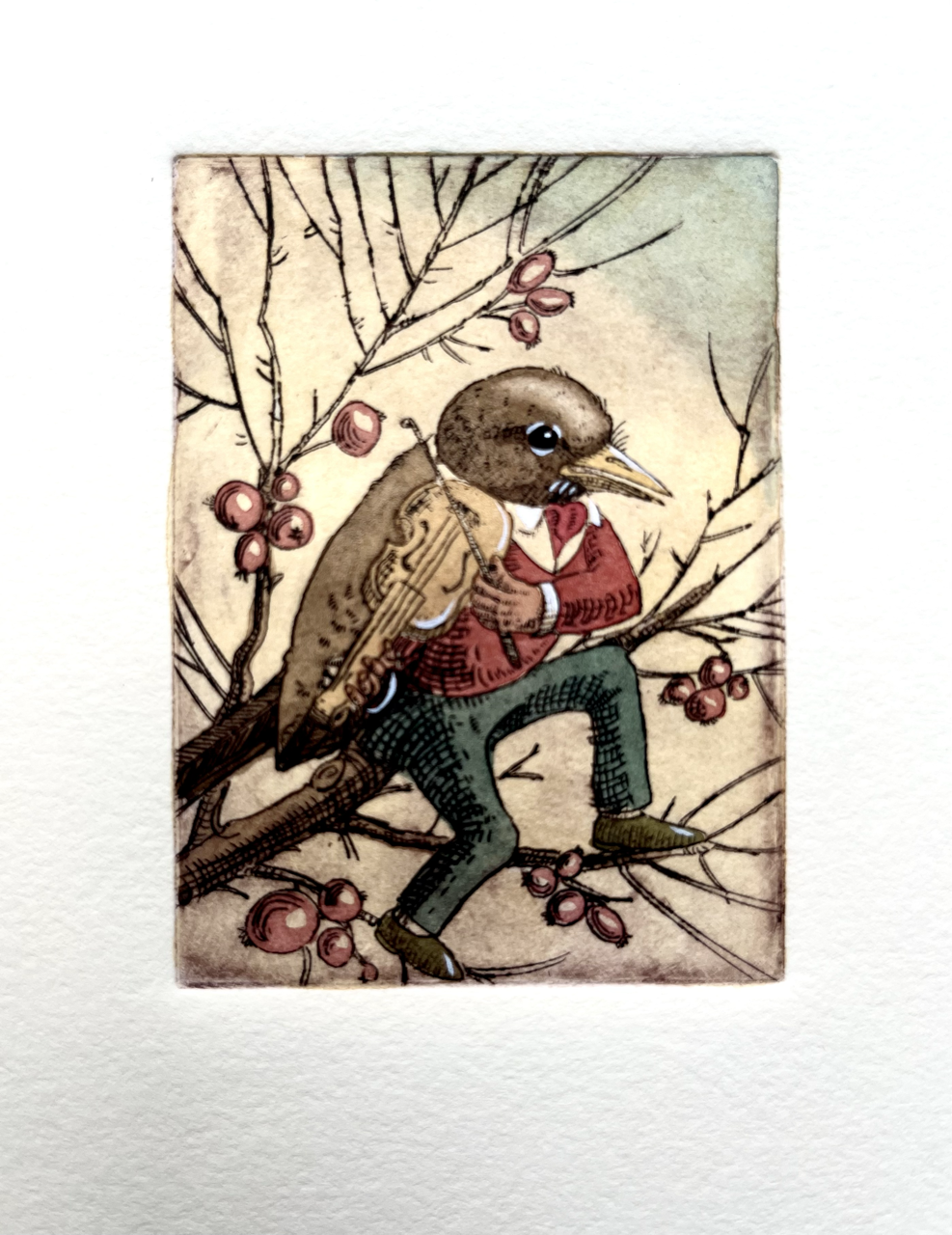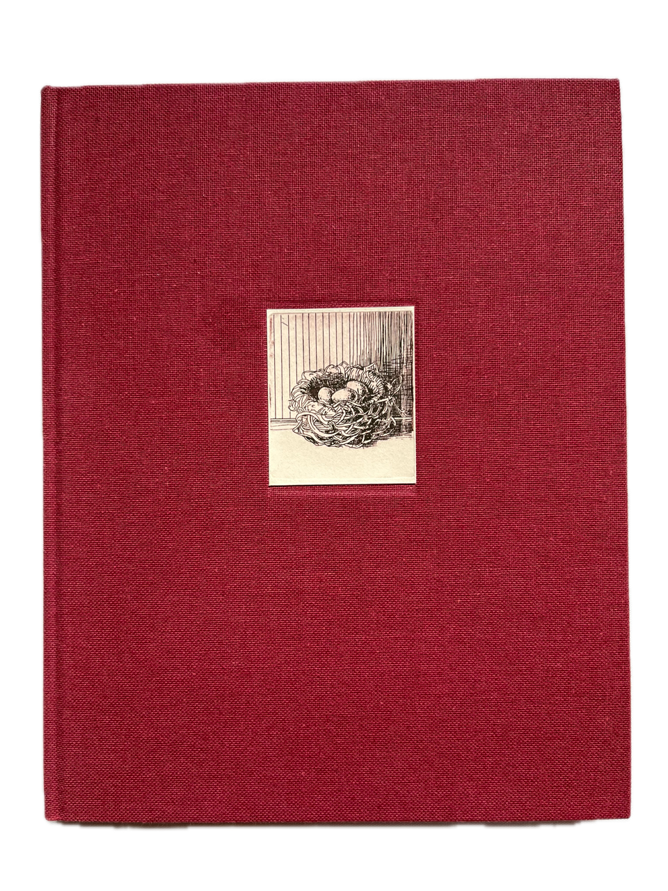 Small 4to.; publisher’s deep red cloth with small etched paper label featuring a bird’s nest inlaid to upper cover, hand-marbled endpapers, housed in original red cloth slipcase; pp. [36], printed on fine handmade cream card, fore- and lower edges untrimmed; title-page with a small onlaid and handcoloured engraving; with 7 additional striking original etchings, each carefully handcoloured by the artist and guarded by tissue; with beautifully typeset prose in dark green and deep red, and decorative printed borders in sepia; a fine copy, as new.