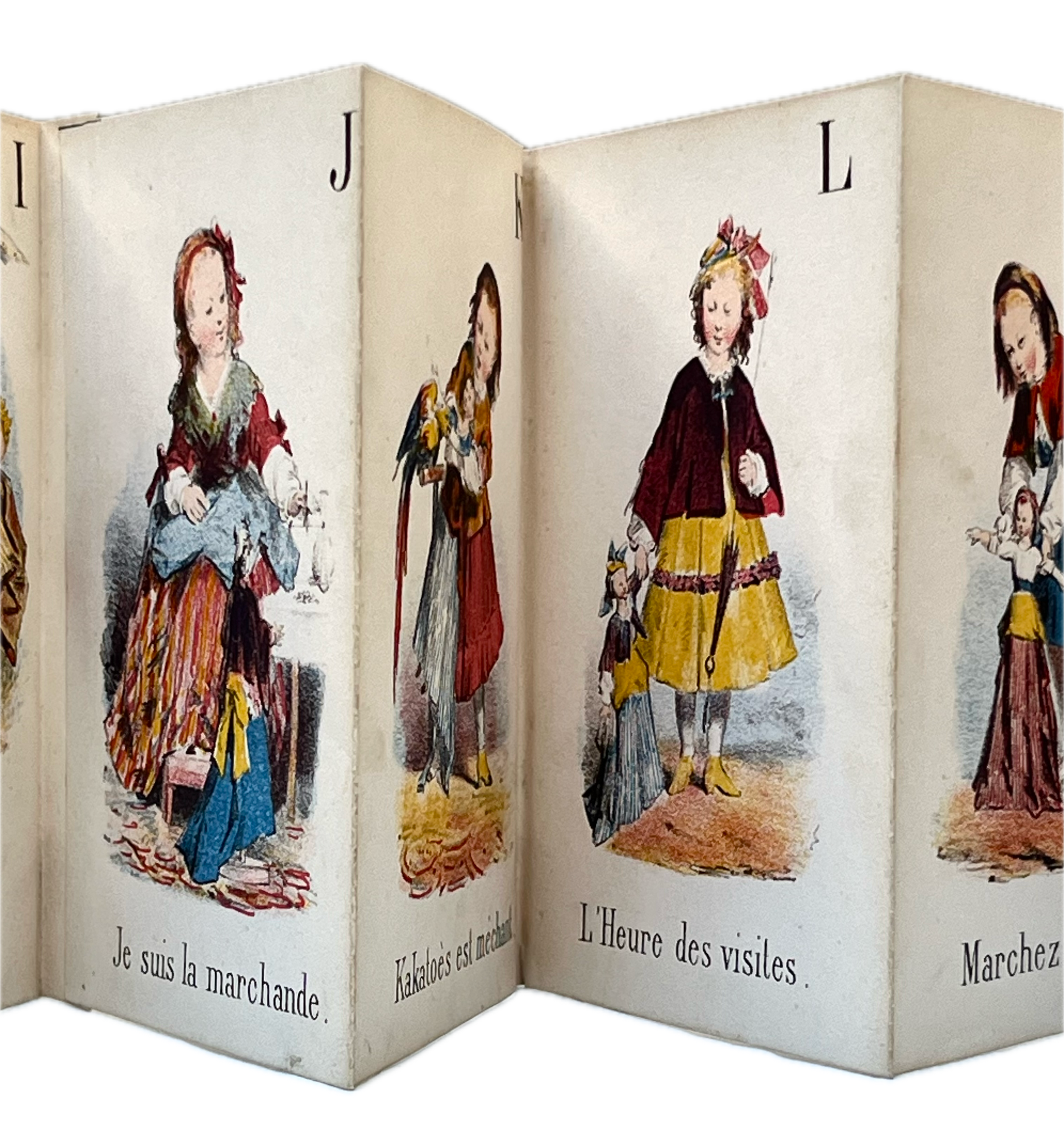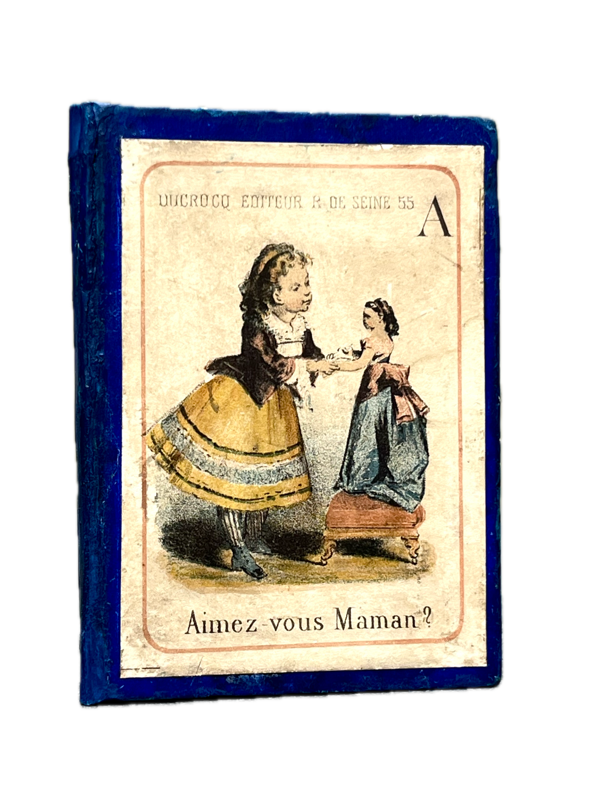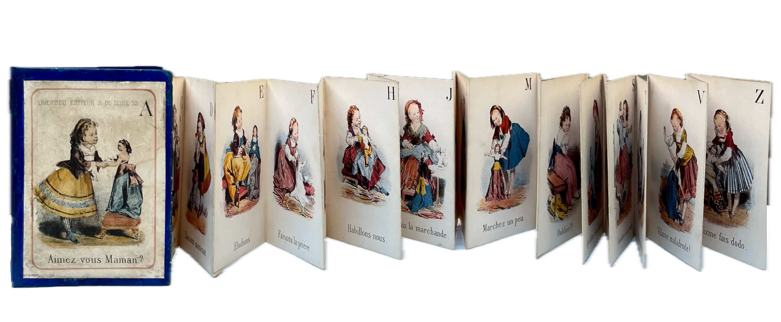 12mo., 84 x 114mm; publisher’s blue boards with pictorial label lithographed in colours to upper cover, housing a 24-leaf accordion-folded booklet of colour lithographs, extending to circa 171cm, depicting young girls playing imaginatively with their dolls (Aimez-Maman; Baisez Petite Mère; Caressez Minet; Dansons Maintenant), with X and Y combined and not including the letter W which was introduced to the French alphabet in the nineteenth century; sometime skilfully and sympathetically rebacked with blue paper, with external dusting and rubbing, with some abrasion to lower cover; internally clean and fresh; rare.