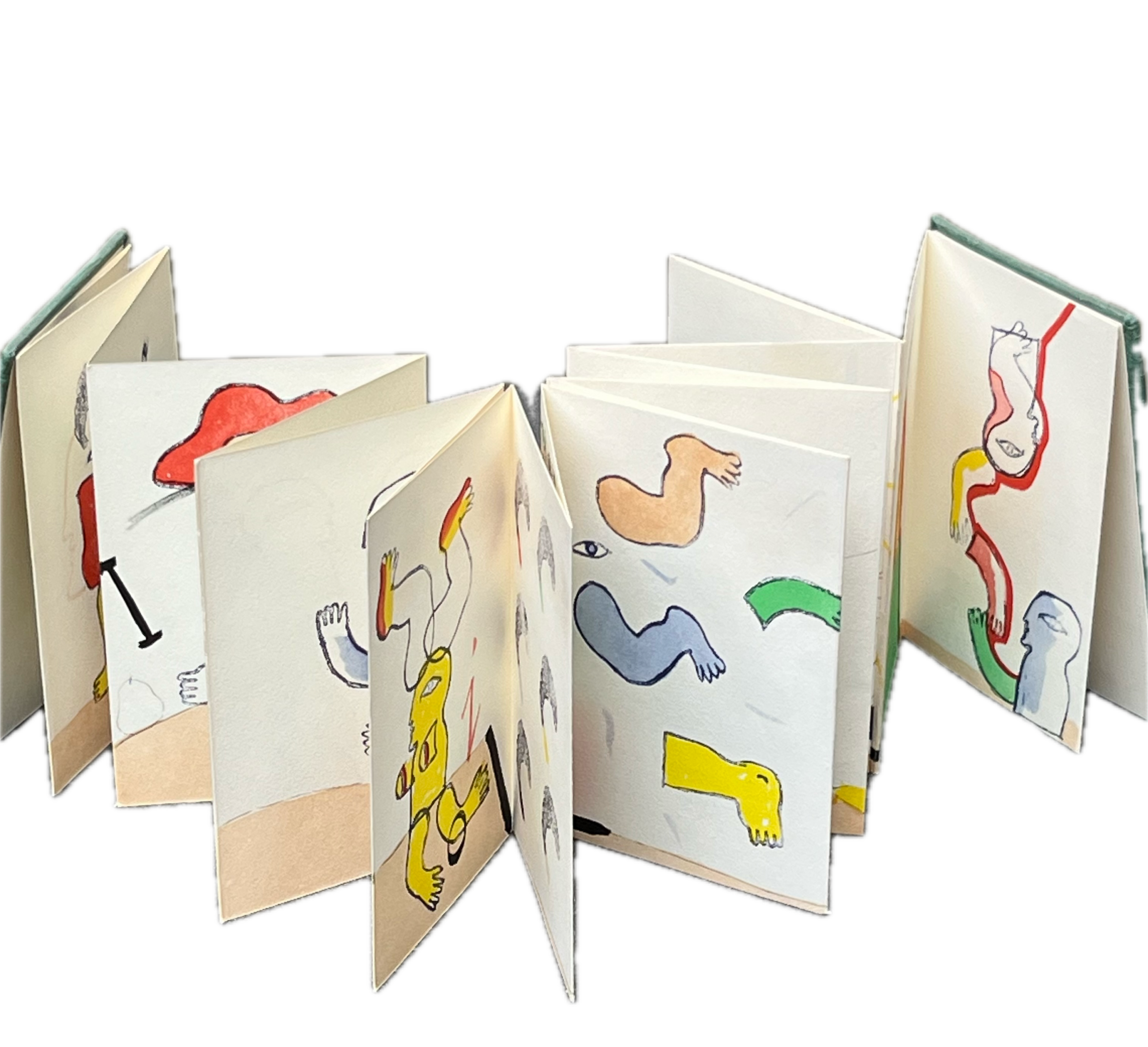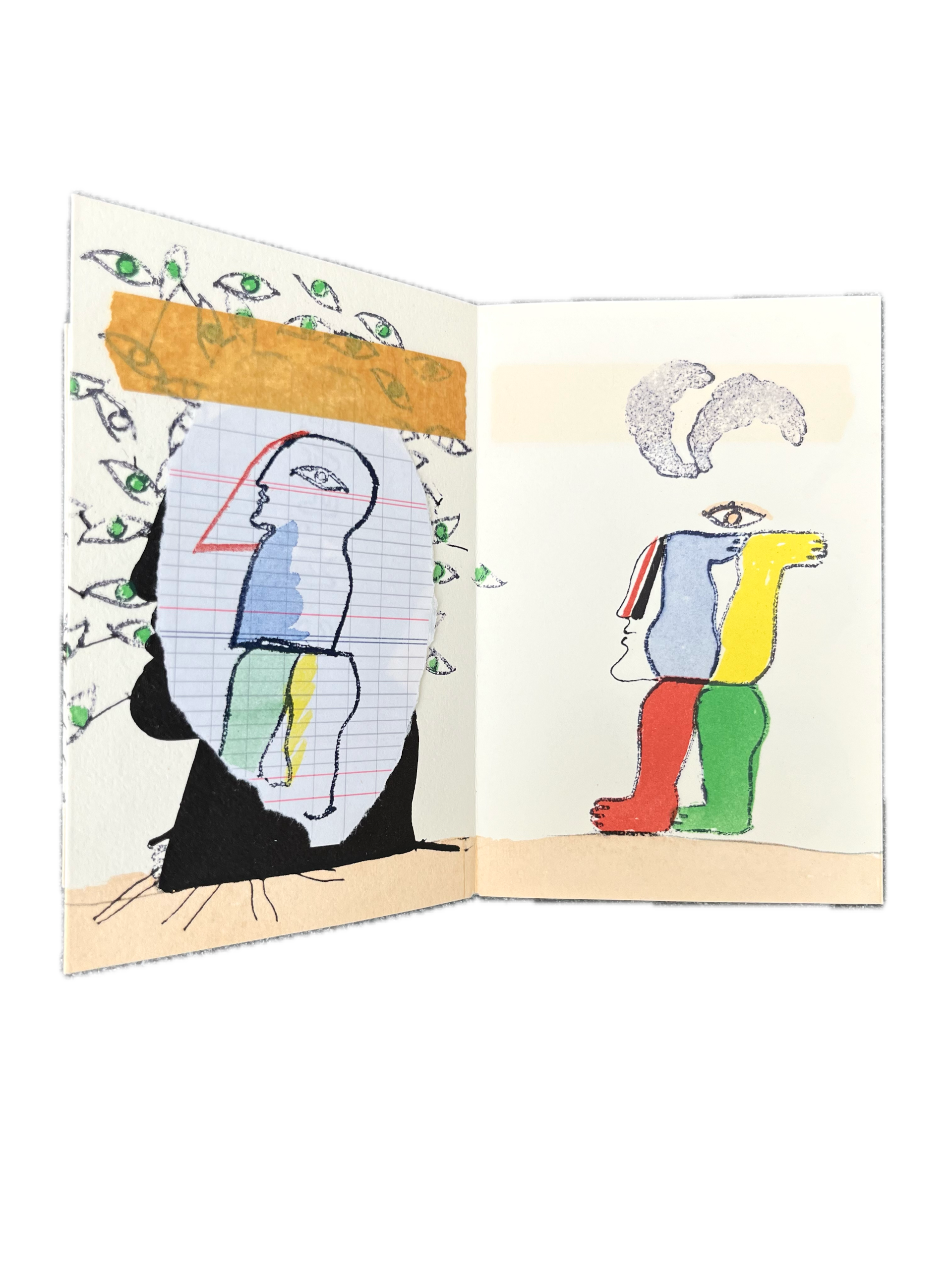 8vo.; original green slubbed hessian-covered boards lettered in black; housing a 22-leaf accordion-folded panorama of a total of 37 coloured photo-lithographed plates of rubber stamp designs by the artist, with lithographed text, two plates incorporating collage elements in the form of a cloth scrap (from the binder’s studio) and an overlay printed in colours on ledger paper and taped in by the artist, the leporello printed to both sides; very fresh, both externally and internally.