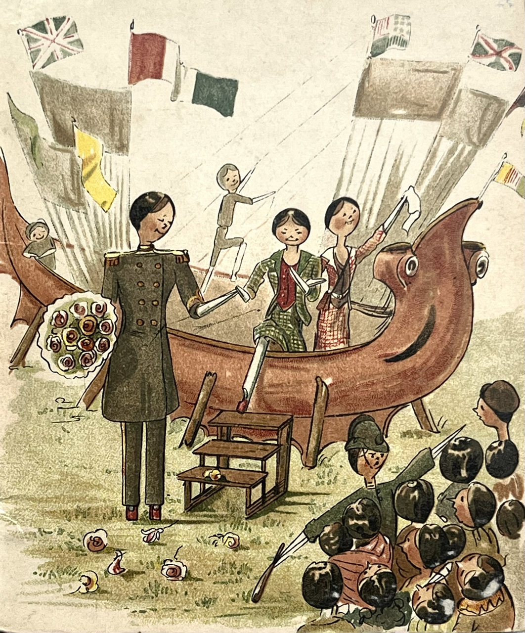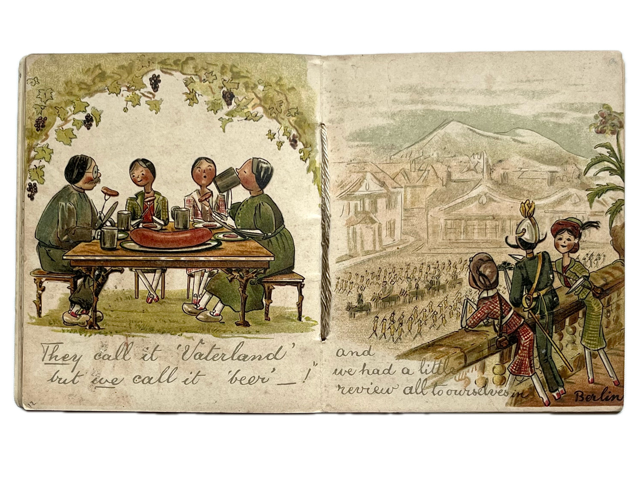 First edition. Ainslie’s characterful plates of her wooden-peg dolls show them trying the latest fashions in Paris; hiking and rock-climbing in Switzerland, watching a military parade in Berlin; horse riding and beer drinking in Germany, being abducted by brigands in the Alps and being rescued in an airship