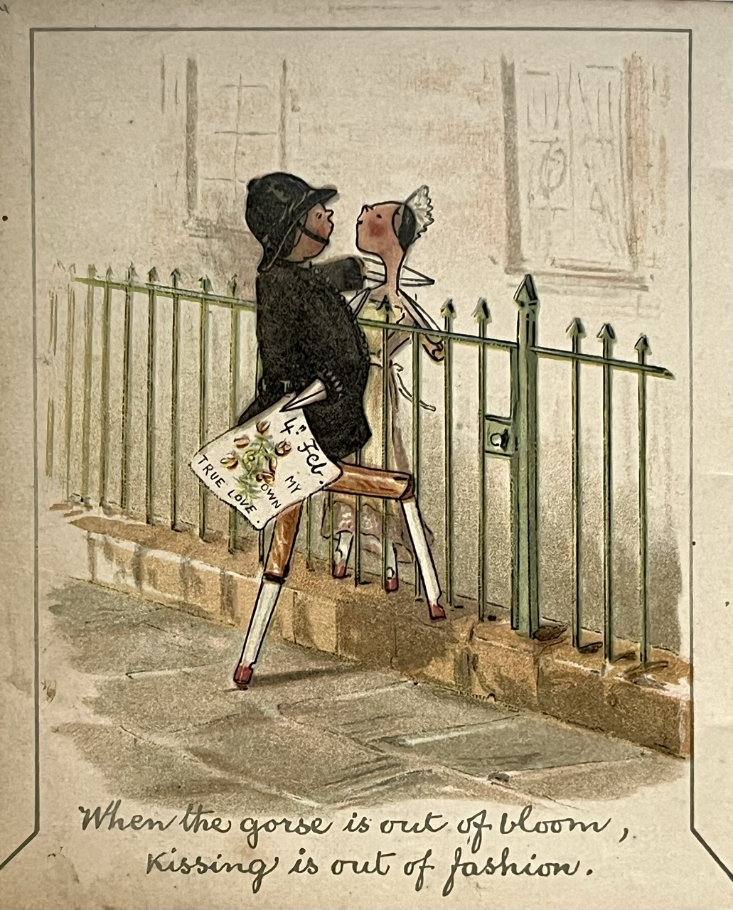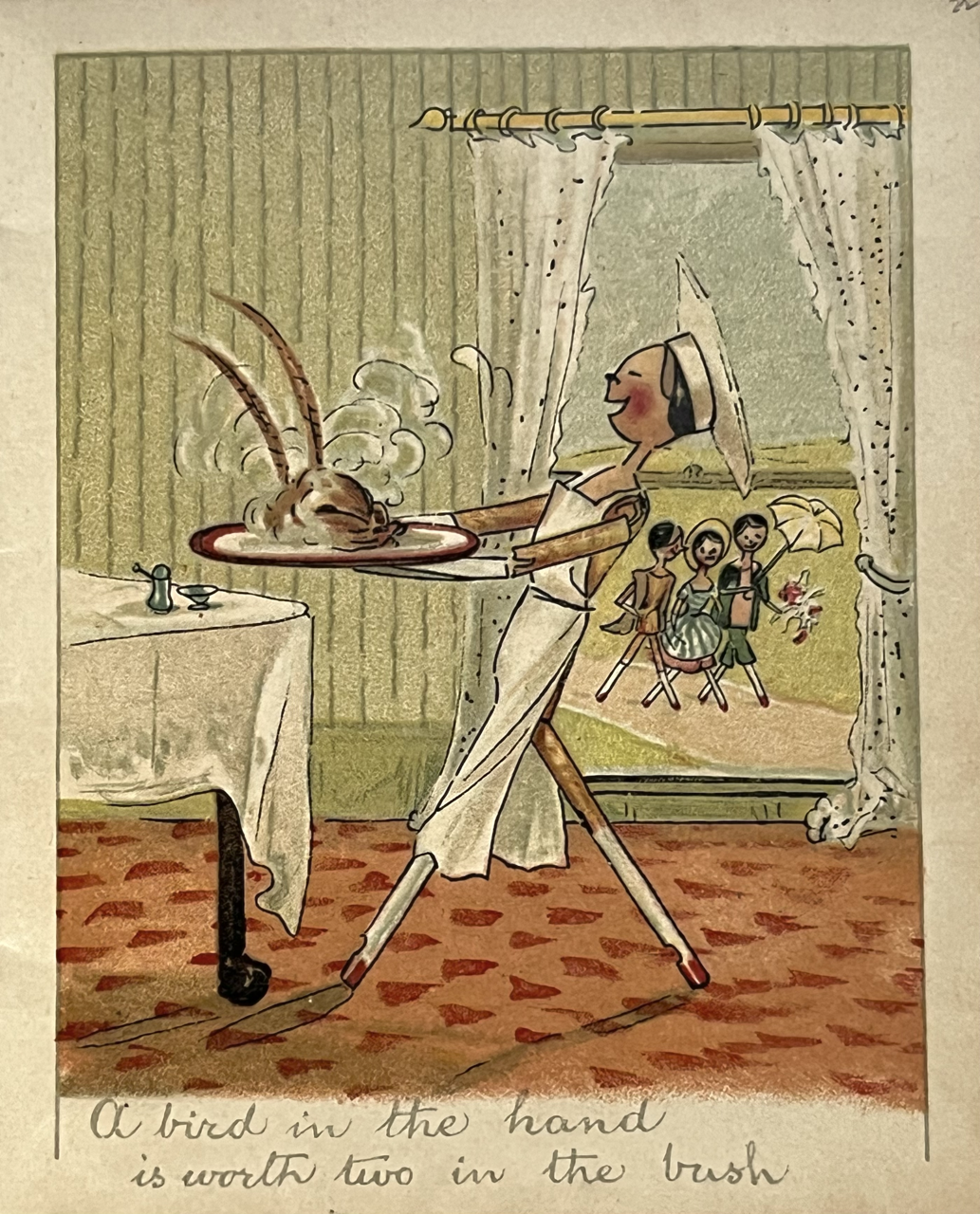 First edition. Ainslie’s characterful plates of her wooden-peg dolls are involved in seasonal activities such as snow play; romancing at the beach and on Valentine’s Day; angling; walking in the rain, etc.