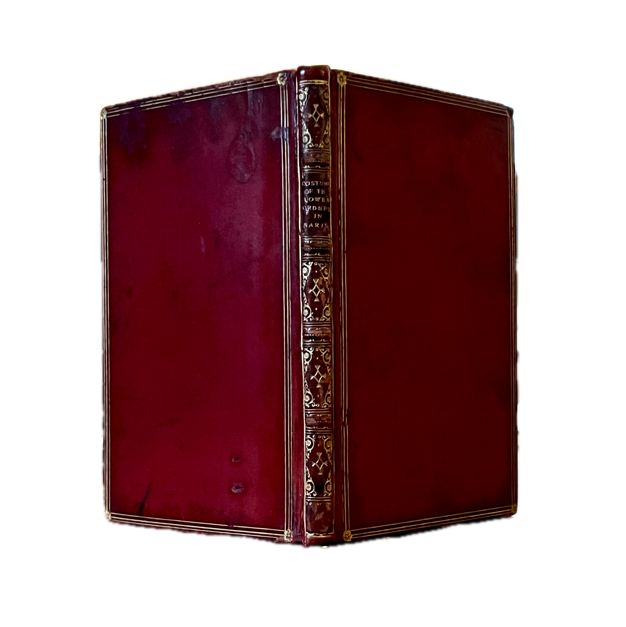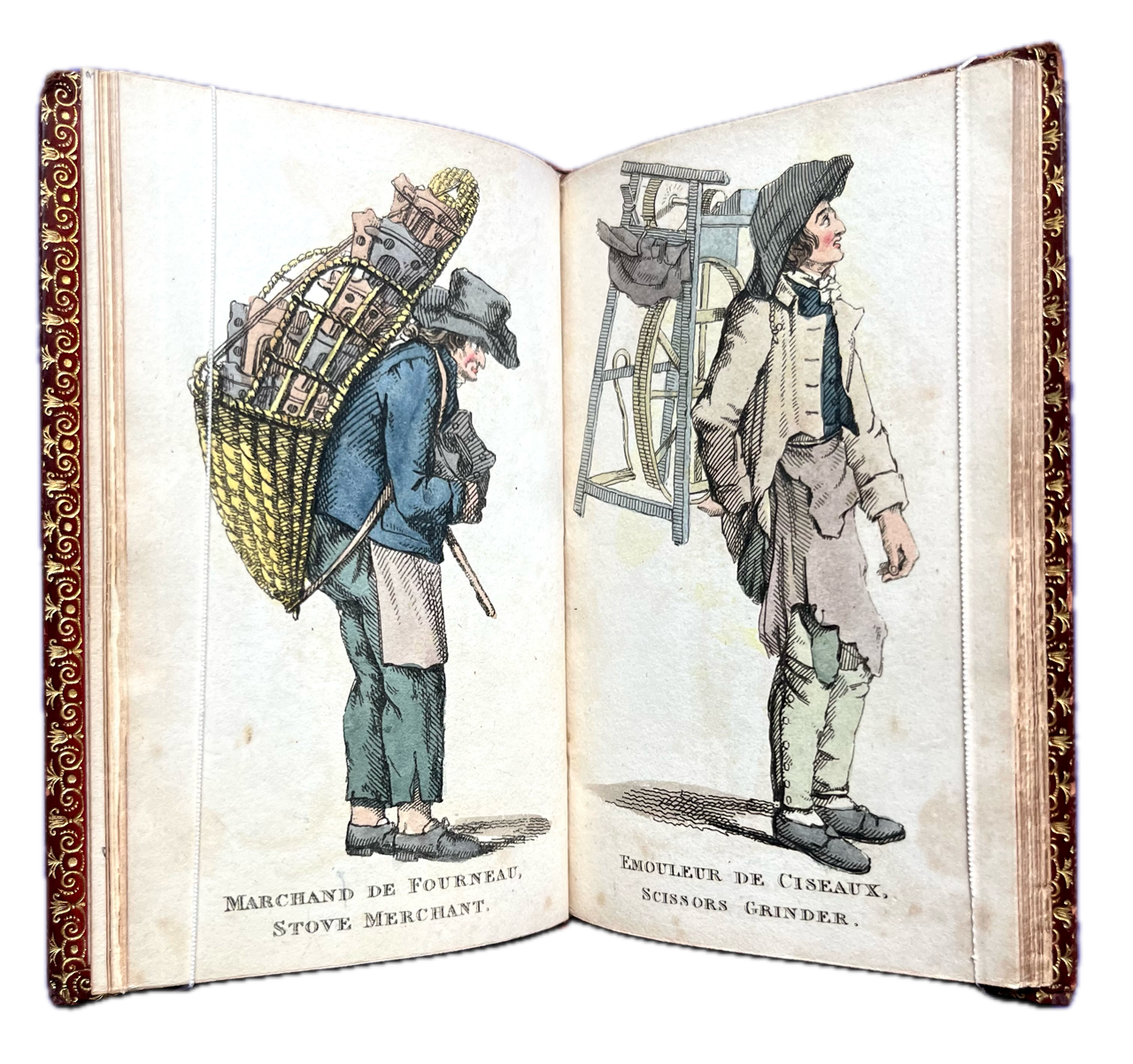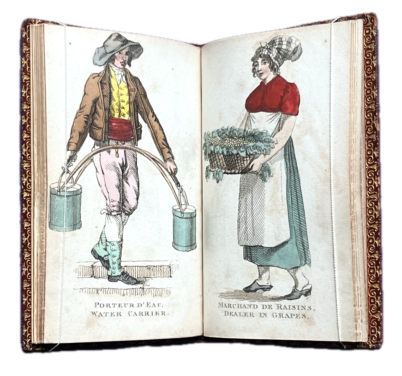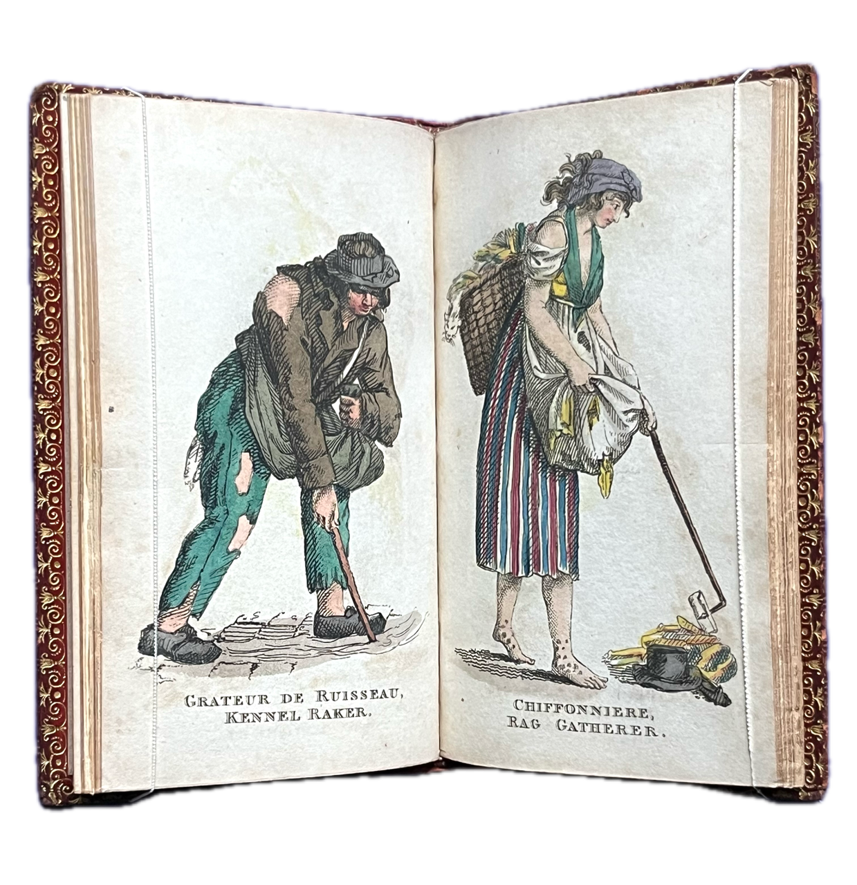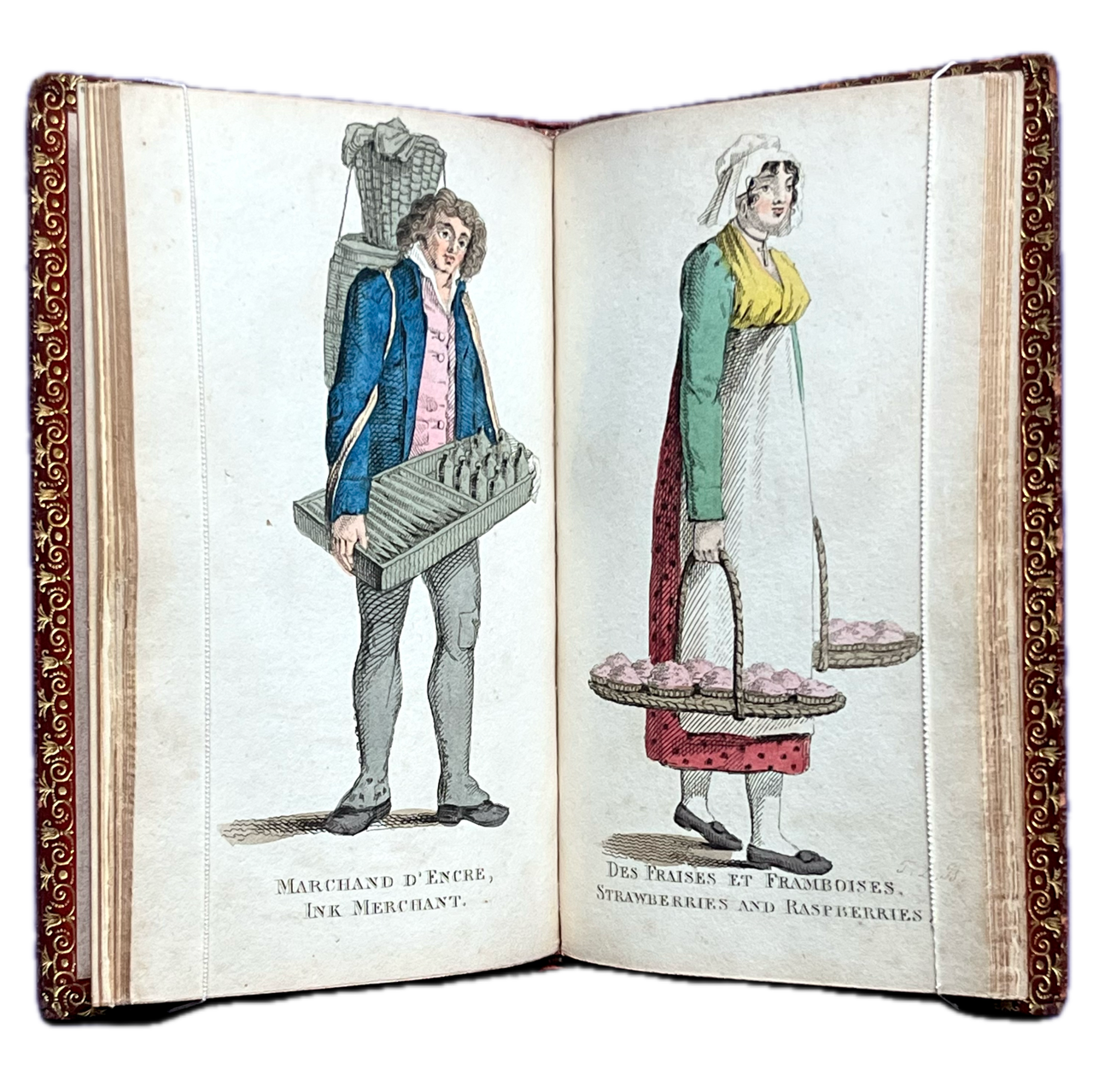 12mo., (90 x 145mm); neatly bound in nineteenth-century full red calf with triple-line gilt panel to sides, spine with 4 raised bands, elaborately gilt in compartments with gilt lettering direct, an early, skilful and unobtrusive, reback relaying the entire early nineteenth-century spine, gilt edges to boards, gilt dentelles, all edges gilt; pp. [58], bound with binder’s blanks to front and rear; complete with finely handcoloured title-page (incorporating etched initials T.L.B), frontispiece, and 27 further large etched plates with skilful and original handcolouring, including one folding (Marchand des Chiens, Dog Dealer), with captions throughout in French and English etched in the plate; a very good, sound, and attractive copy with some external soiling and marking and a couple of 4mm surface abrasions, some blotching to top edge of lower cover, edges rubbed with small wear to forecorners, internally very good, sound and remarkably pretty, with occasional minor marking and browning; a delightful copy; very elusive.
