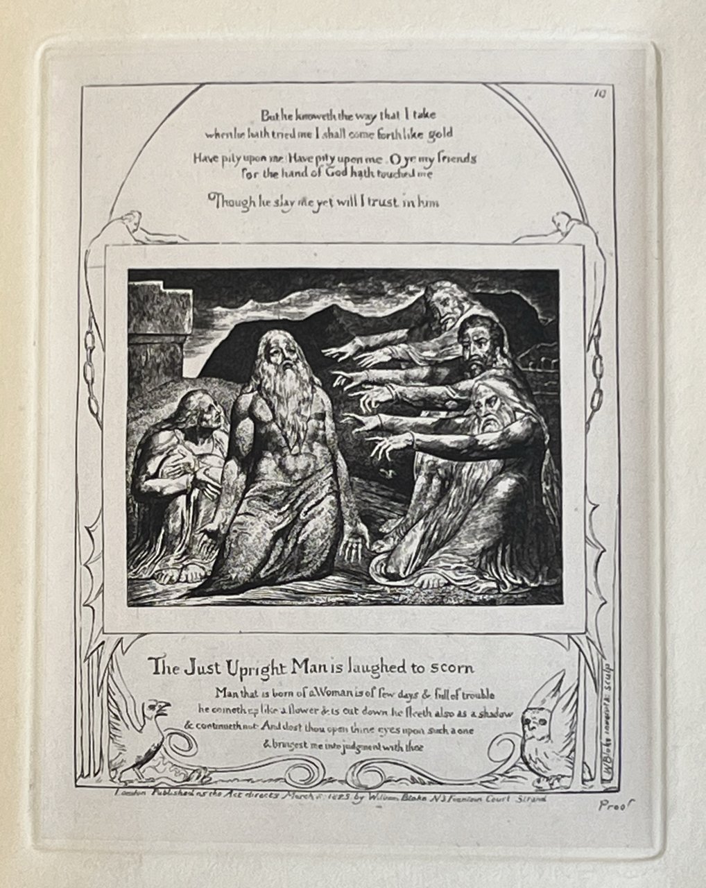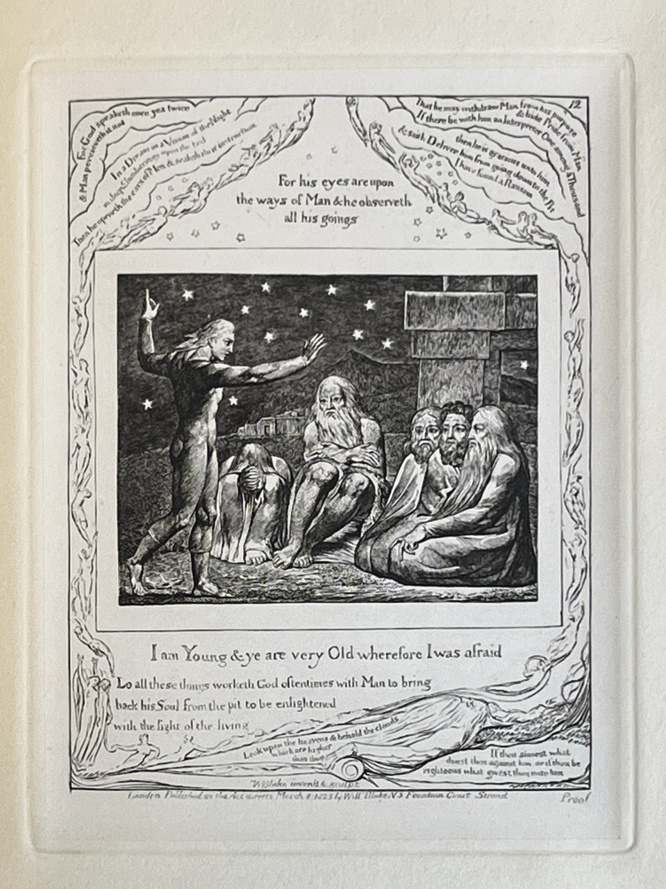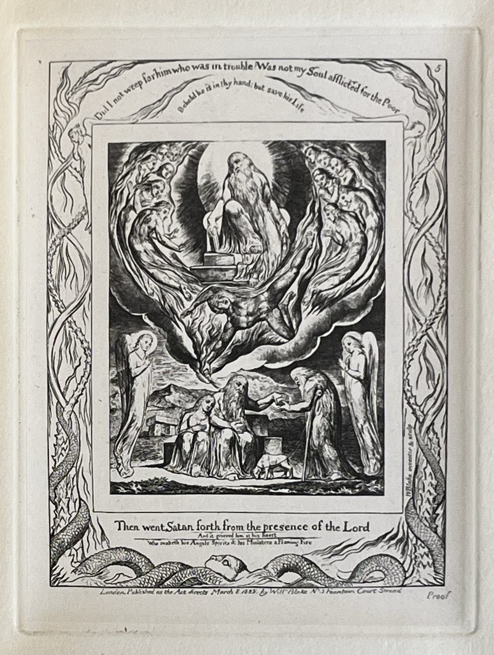 This series of engravings, considered among Blake’s finest achievements, was originally commissioned in 1823 by John Linnell to alleviate his protégé’s financial difficulties. In 1821, his patron had requested a repetition of the Job watercolours created for Thomas Butts (c.1805-6) which were traced by Linnell himself and then handed to Blake for colouring. Linnell then ordered 22 engraved subjects, for which project the artist made new pencil drawings, reducing the scale of the watercolours, adding borders, and, in some cases, outline designs and numerous inscriptions taken from the Bible, which elucidate the story. This work is a characteristically personal adaptation of the theological text, influenced by Blake’s own mythology. Only 7 copies located on Library Hub (COPAC): Univ. of the Arts, London (?2 copies); Leeds Libraries; Univ. of Liverpool; National Lib. of Scotland; BL; King’s College, Cambridge.