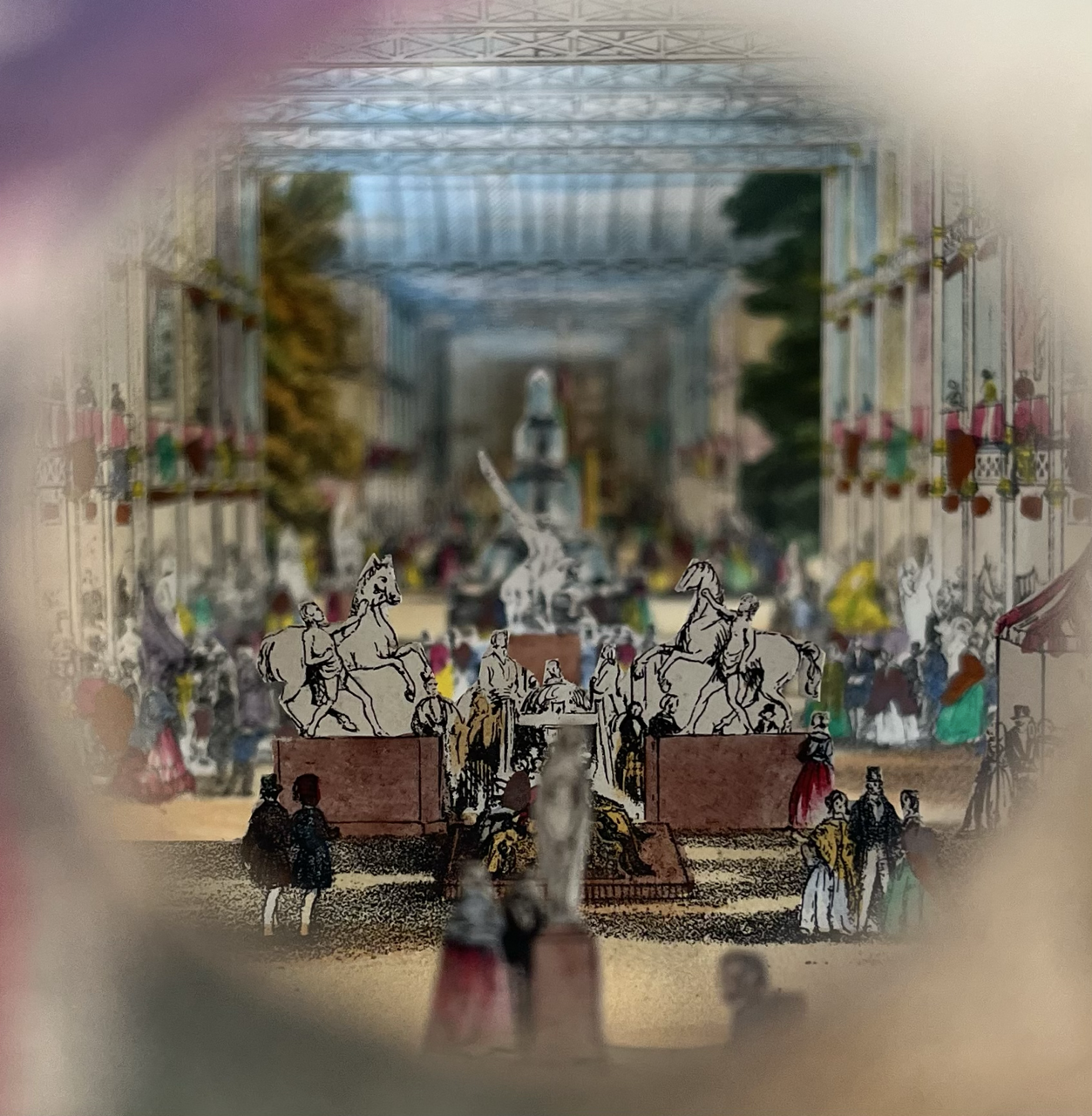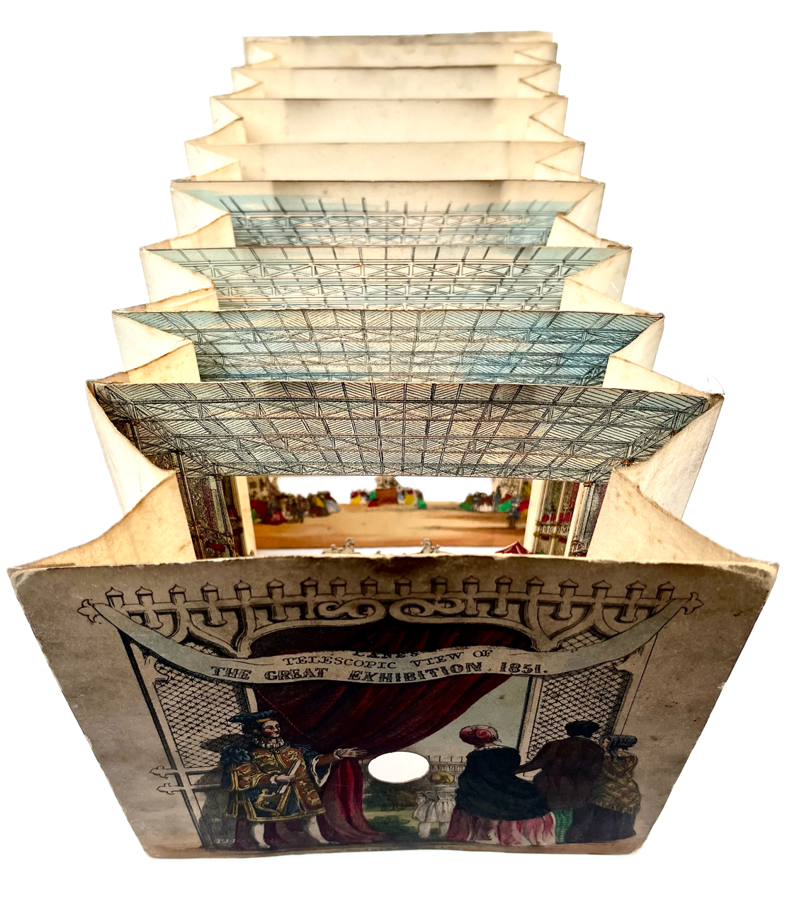 This accordion-folded optical toy depicts the scene surrounding the central transept of the Crystal Palace, constructed in Hyde Park London. Using the peephole on the cover, which simulates a lens, the viewer is treated to the spatial effect of gazing into the vast interior of the building, with its iconic additions including the massive fountain and the giant elm trees which were housed under the impressive glass roof.