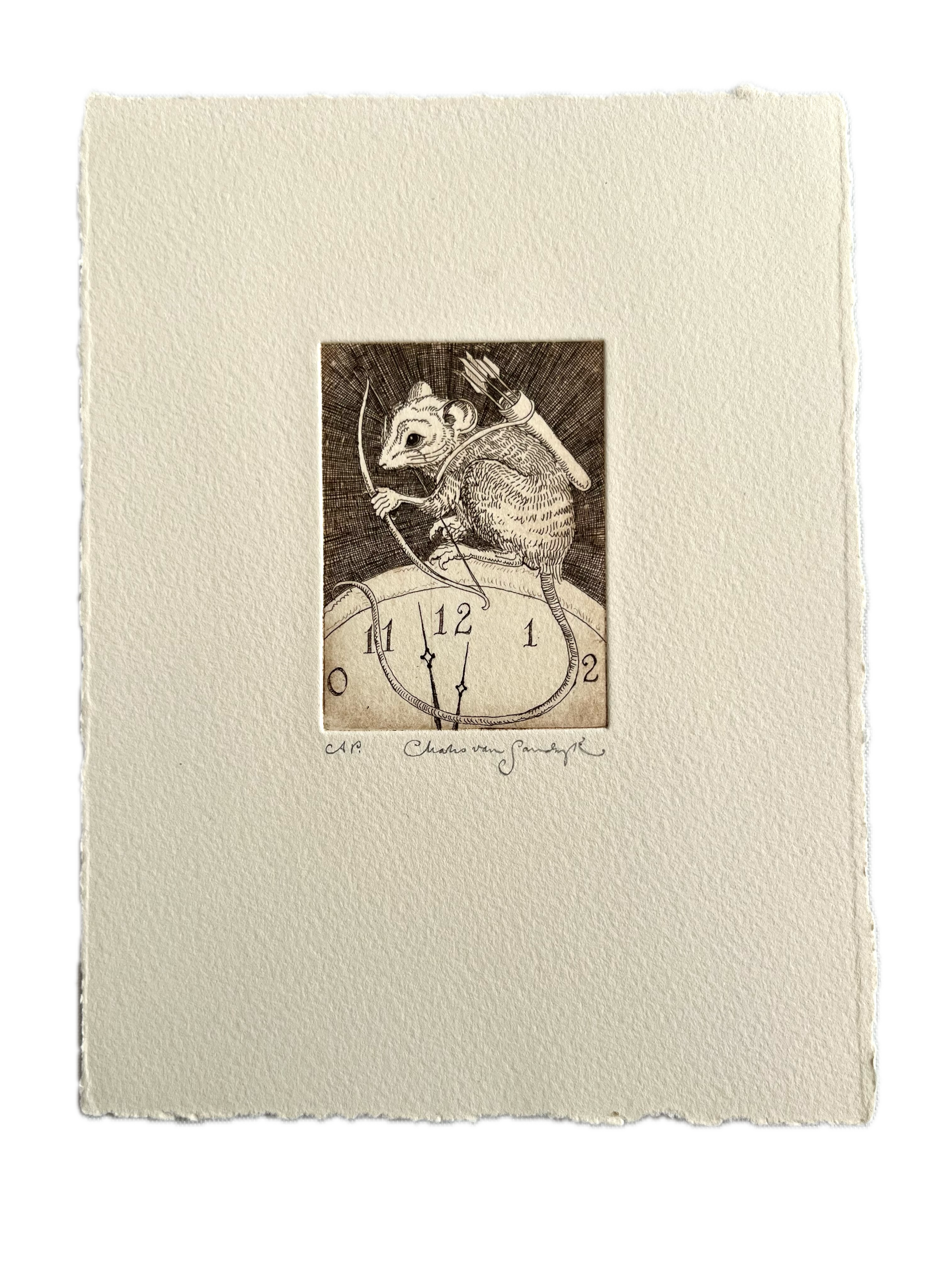 A charming original copperplate etching, printed in sepia, with the artist’s printed monogram in the corner, on handmade ivory artist’s card with untrimmed edges (card size circa 190 x 144mm, image size circa 53 x 72mm) depicting a mouse, with a bow and quiver full of arrows sitting above a pocket watch, with ‘A.P.’ (Artist’s Proof) in the artist’s hand and the artist’s signature, both in pencil, to the lower margin; in fine condition.