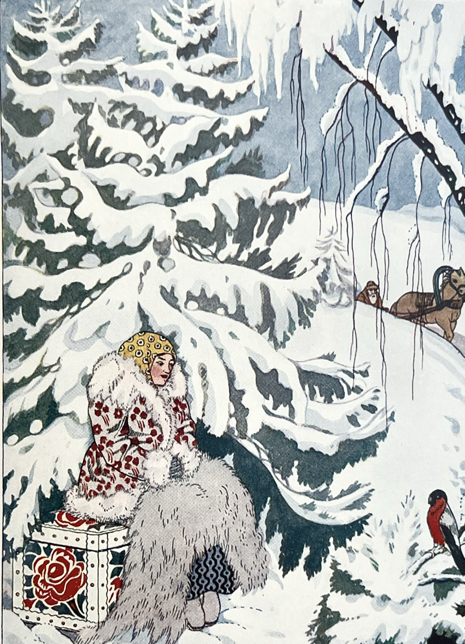 The tales are presented as related by an old Russian peasant to his grandchildren round the fireside and include magical creatures, heroic challenges and moral lessons, as well as the legend of Baba Yaga, the iconic witch of Russian folk history. Stories include “The Silver Saucer and the Transparent Apple”, in which a young girl outwits her greedy adversaries; “Frost”, the tale of a boy who outsmarts the icy spirit Frost using his talent of quick thinking, and “The Little Daughter of the Snow”, a poignant winter story of familial love.