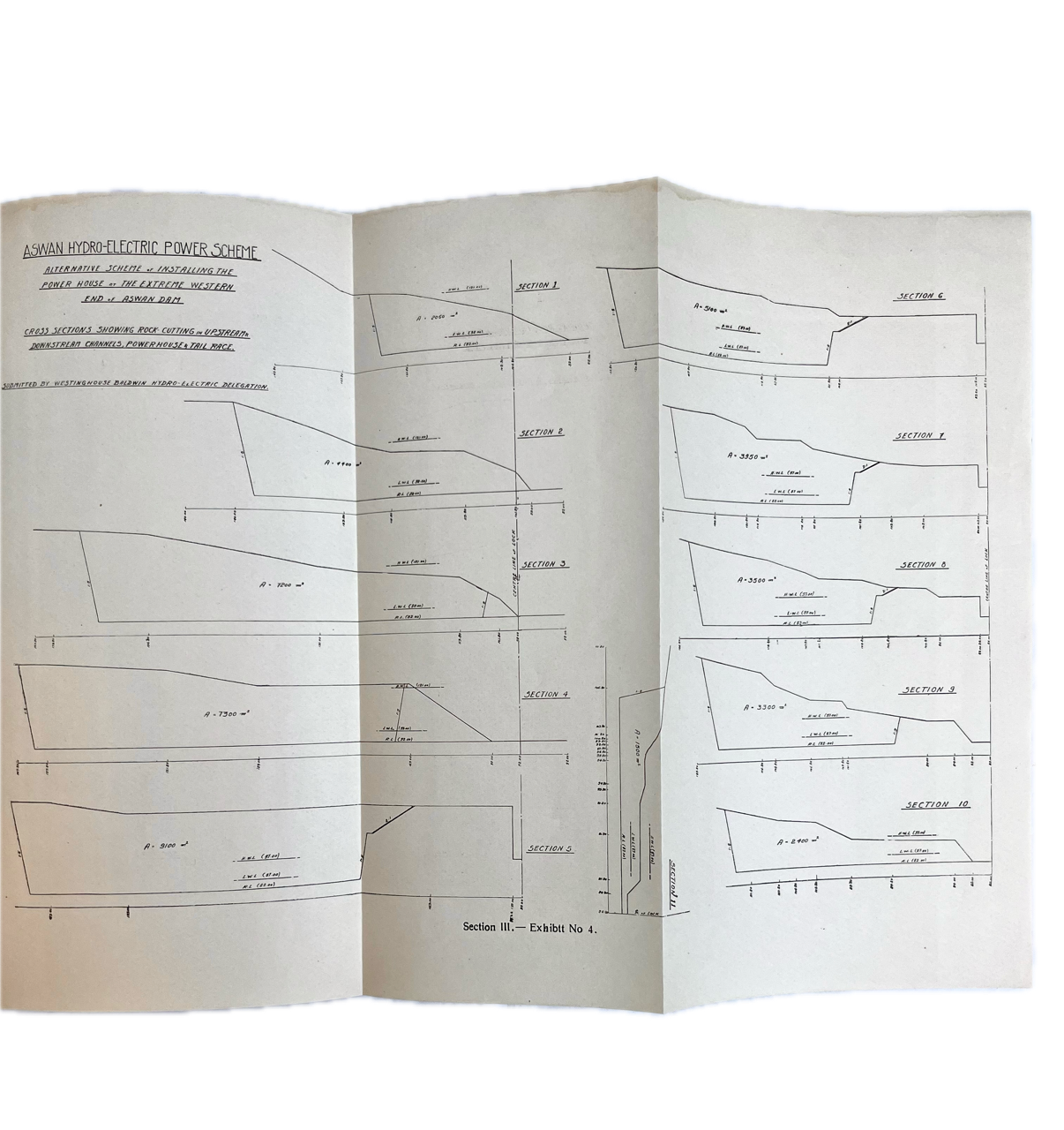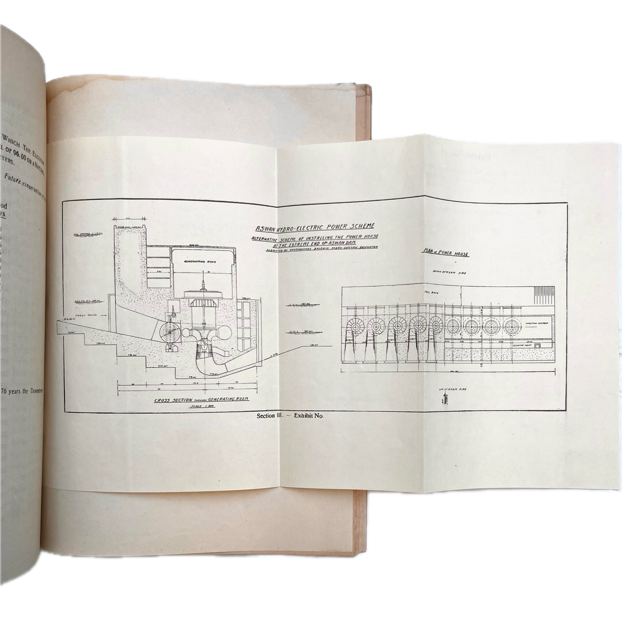 Contents consist of Section 1 – Summary of Conclusions; Section II Report on the Proposed Scheme; Section III: Turbine Performance; Required Reservoir Levels for Maximum Flood Discharges; Discussion of ‘Report on Economic Utilization of Energy available from the Aswan Dam and Nile Barrages Hydro-Electric Schemes’; Channel Alignment Study; Cost Estimate Tabulations including Rock excavation diagram and Estimates; Bills of Material for Machinery; Electrical One – Line Diagram; Tailrace Curve at Various Discharges; Aswan Reservoir Levels and Storage at the Period of Final Emptying, for the years 1933 to 1946; Sectional View and Plan of Proposed Powerhouse; Statistics of actual maximum Water Levels Downstream from Dam; Section IV, Photographic Views of Similar Equipment Built By – The Westinghouse Electric Company and the Baldwin Locomotive Works.
