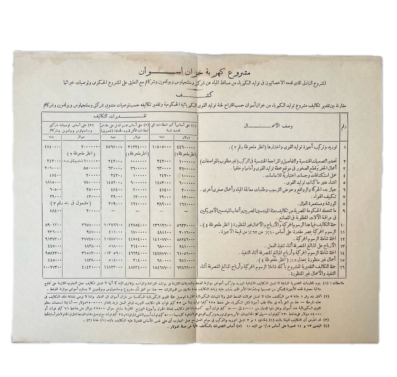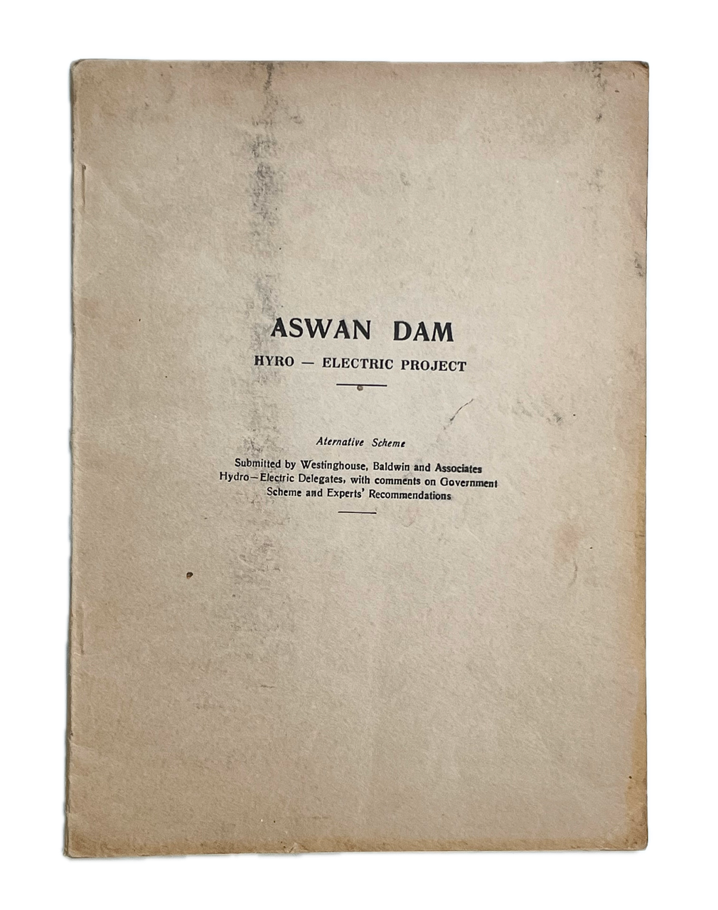 Slim imperial 8vo. (circa 28 x 20cm); original drab wrappers titled in printed black to upper cover, stapled; [iv], 5-59 + [i], with additional plans and photographs comprising 2 printed graphs and 4 printed folding plans, also with a loosely inserted bifoliate in Arabic, translating as “Aswan Dam Electrification Project” which outlines, in columns, projected work and costs, including equipment for butterfly gates, pipes, waterways etc. etc.; with 10 full-page plates after photographs printed in monochrome to the rear; a remarkable survival, externally very sound and good with light soiling, internally crisp and clean throughout save an old water-stain affecting the document throughout at the upper margin, inner corner, mainly affecting the first couple and last 13 leaves, but never encroaching on text or illustration; rare.