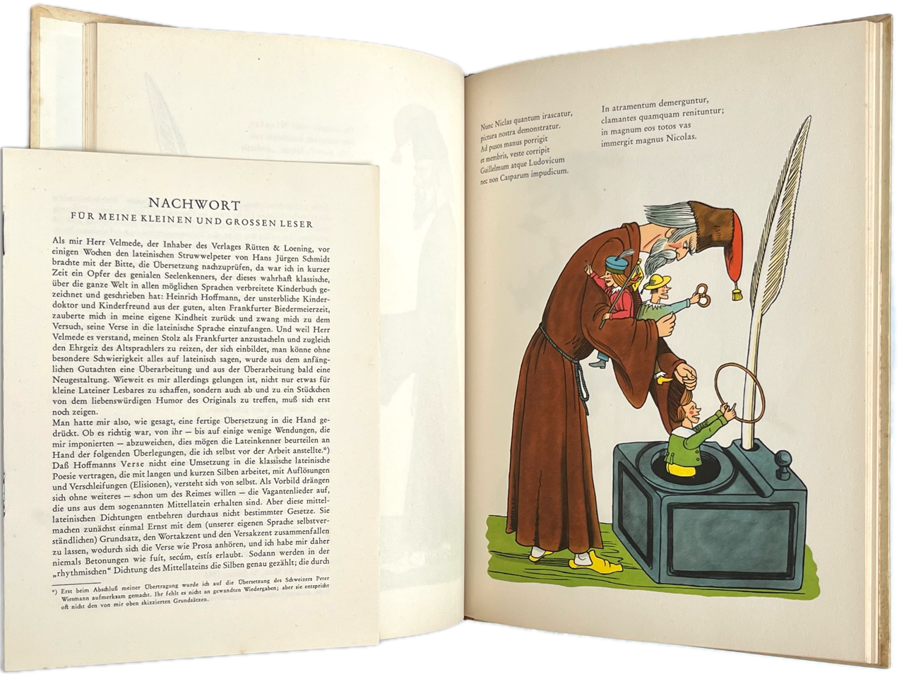 4to.; publisher’s cinnamon-coloured cloth-backed pictorial boards; pp. [52]; with illustrations throughout in colour after Hoffmann’s originals, with pocket to the inner lower cover containing the original 12-page translation of the Latin into German; a nice copy with overall dusting and slight spotting to boards, mild uniform fading to spine cloth; internally fine throughout, without inscription.