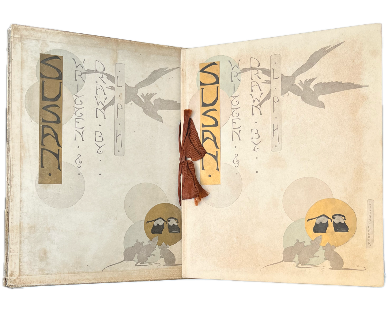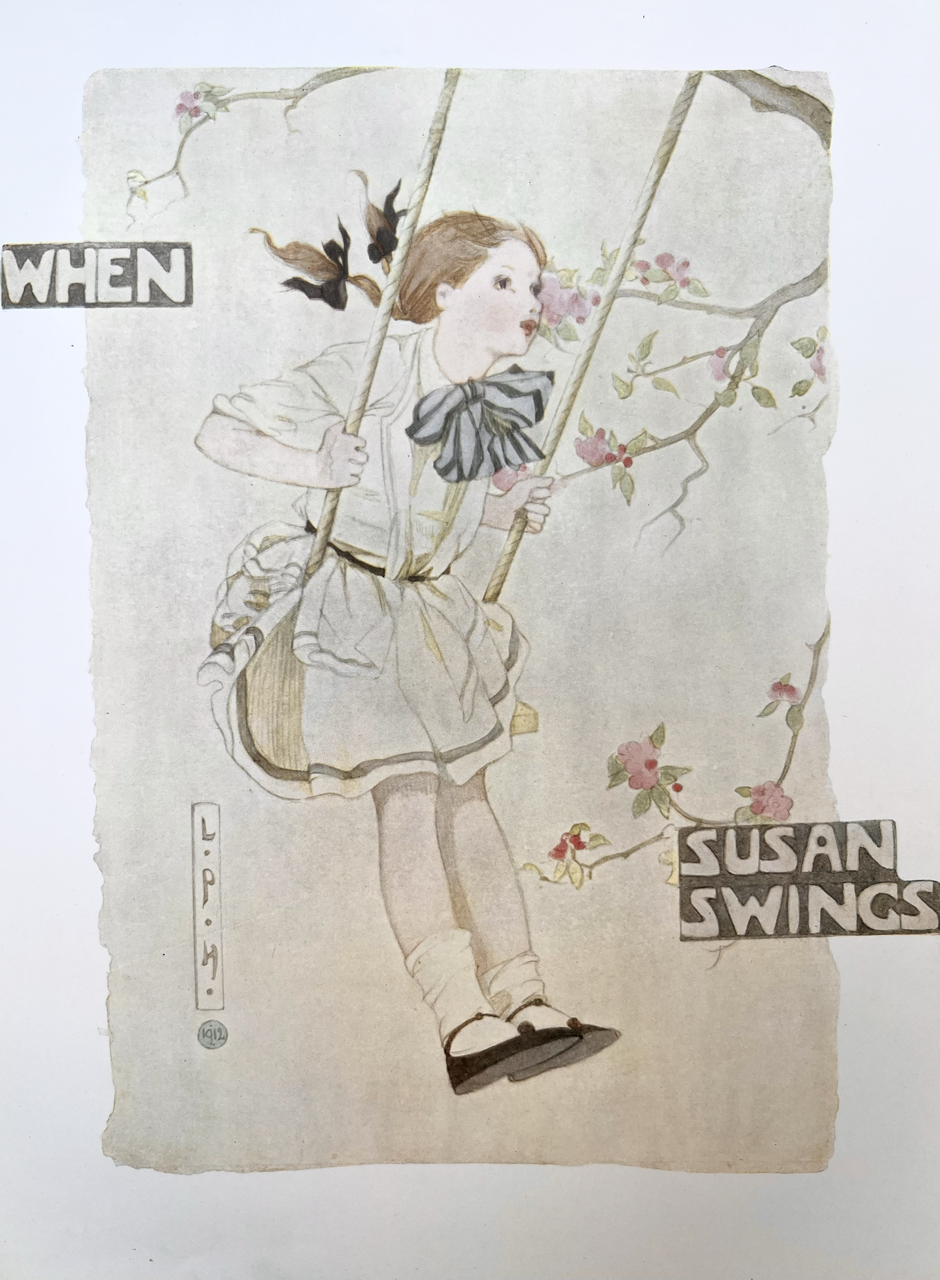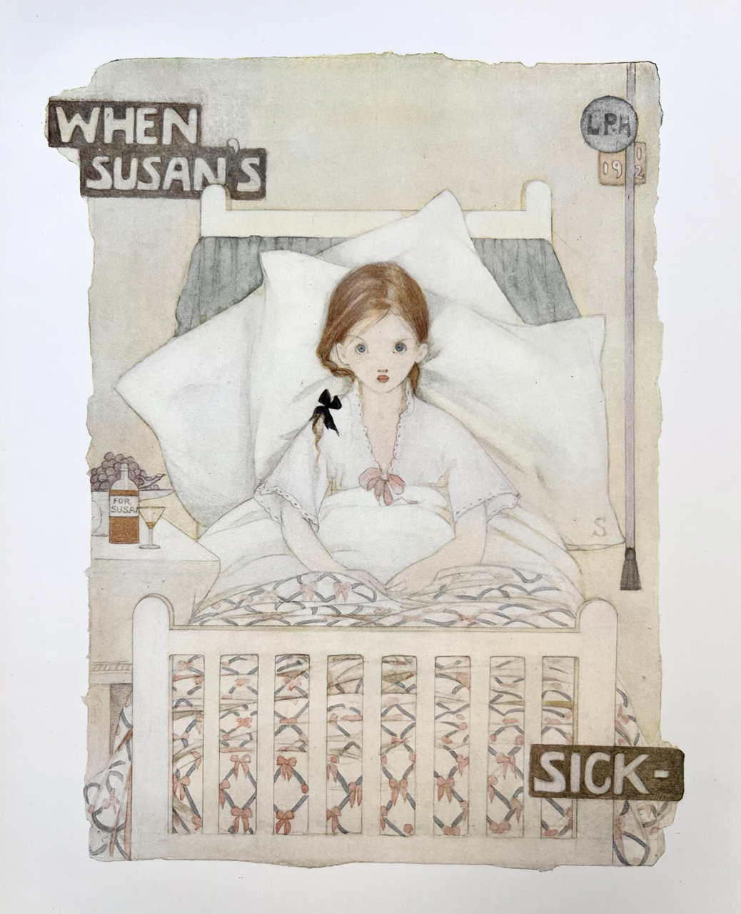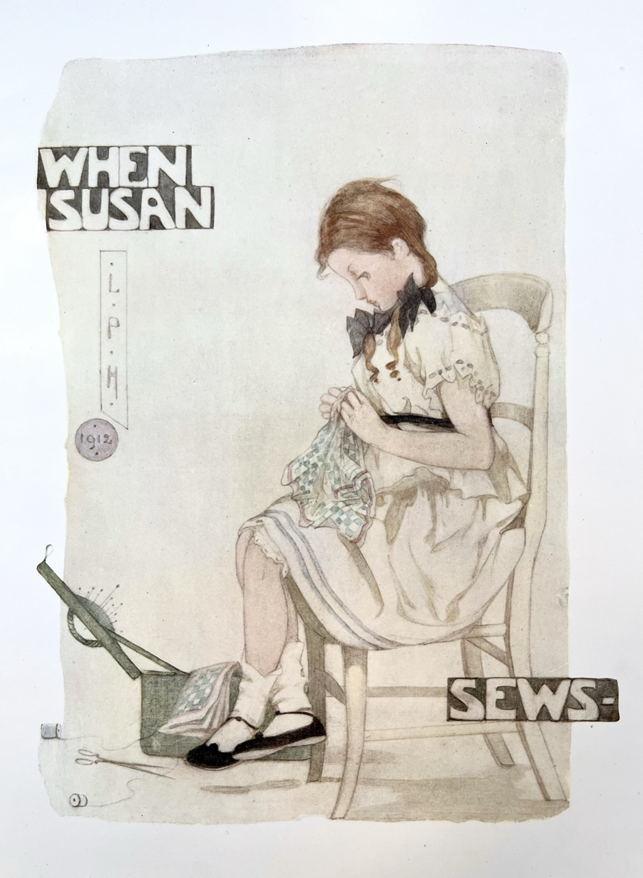 The young Edwardian girl, Susan, is portrayed engaging in various daily activities, sewing, skipping, lying ill in bed; sleeping, dressed smartly; sniffing; sighing, etc. Each striking plate is accompanied, overleaf, by a witty little verse.