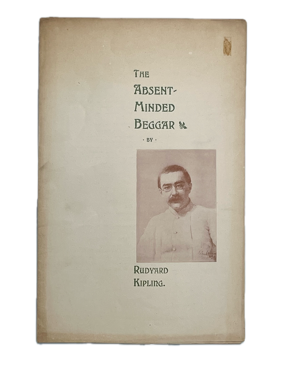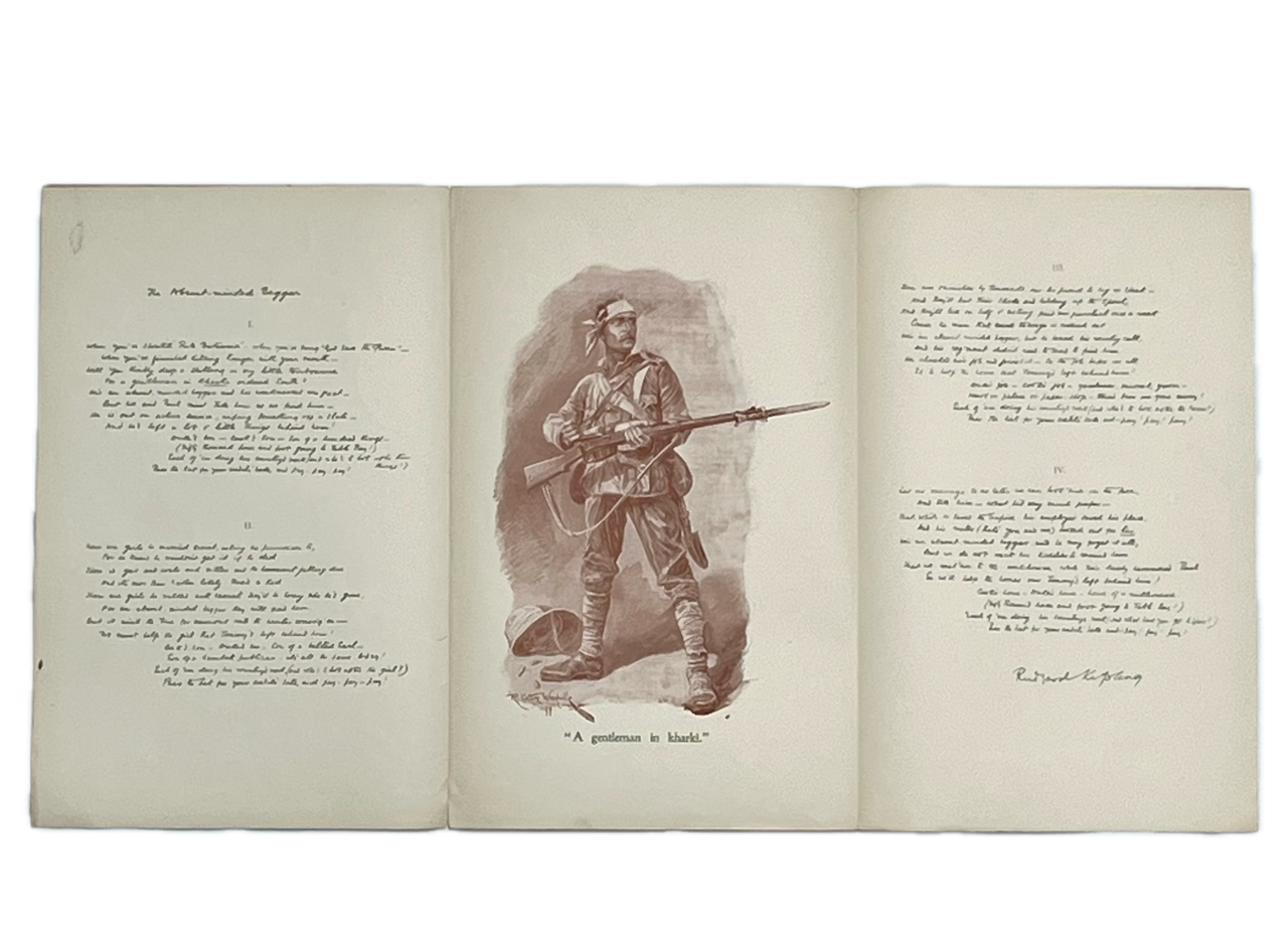 Folio (32 x 25mm); a single sheet folded triptych-style and printed on all 6 sides on coated paper in dark green and ox-blood, small photographic portrait of Kipling to upper cover; the verse printed in green after his original manuscript, and including a full-page illustration (”A gentleman in kharki”) by Richard Caton Woodville; toned with a small brown mark (17mm) to upper corner of cover, with a single closed fold-tear (20mm).