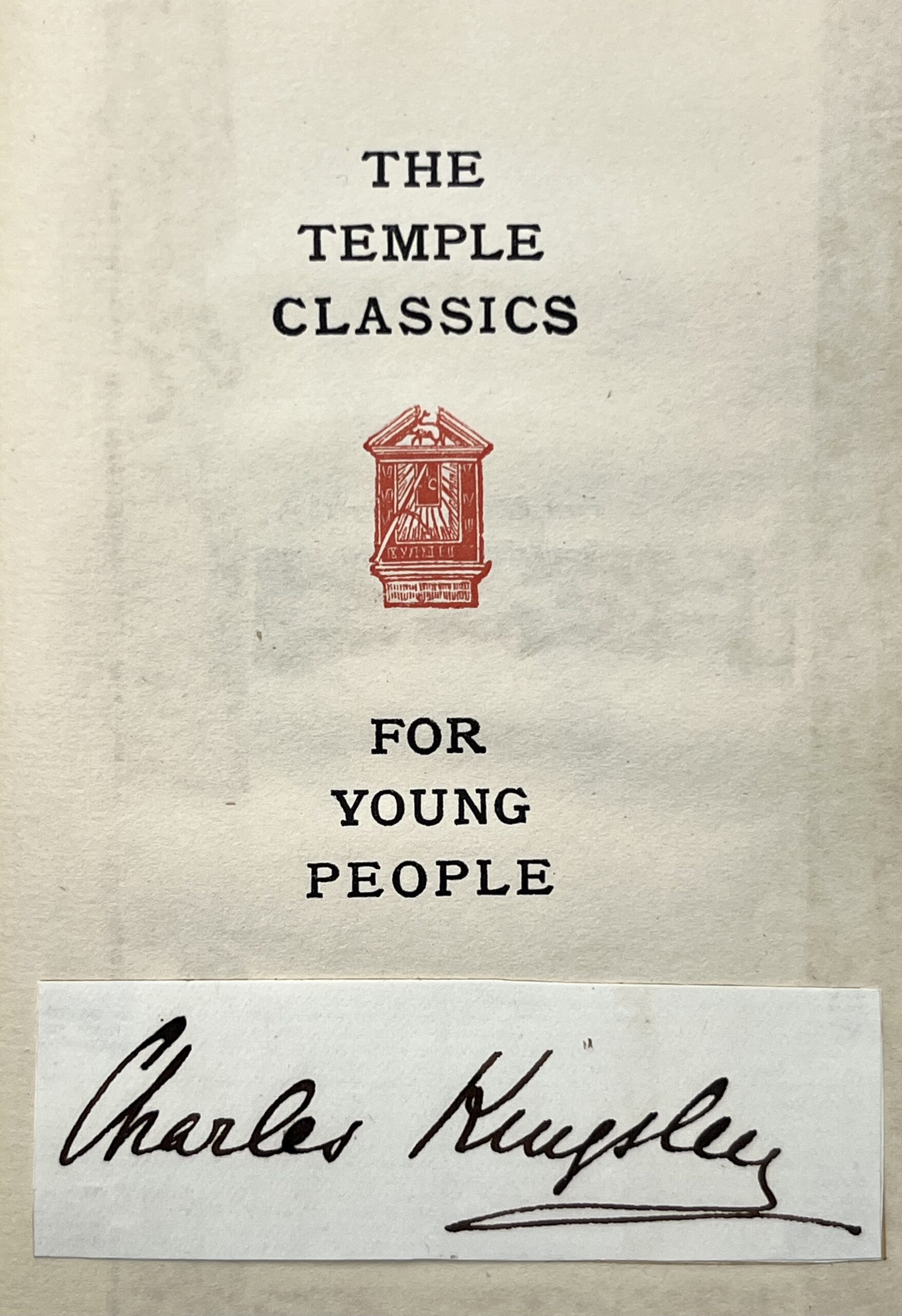 First thus, the abridged Temple Classics Edition for Young People. Originally published in its entirety in 1856. This copy with a tipped-in signature of Charles Kingsley to the half-title and with, carefully affixed to a front blank, an original photographic carte-de-visite of the author (slightly faded), sometime mounted on cream card with red-ruled border and with Kingsley’s name below in a copperplate hand.