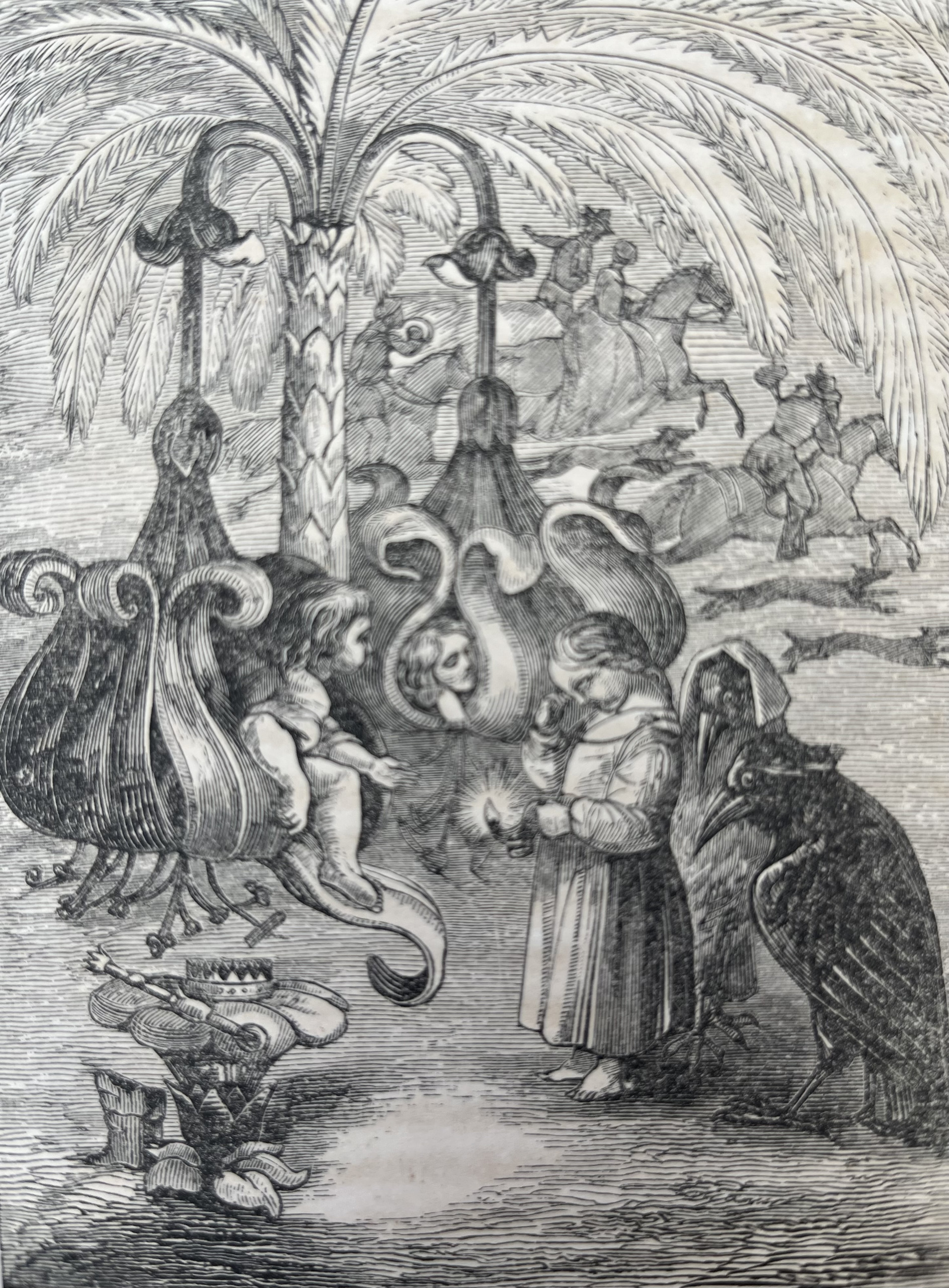 Small square 8vo. Original green finely ribbed blind-stamped cloth, spine elaborately and prettily gilt, neat gilt pictorial vignette to upper board; with engraved frontispiece and 3 other engraved plates by Otto Speckter; book with slight lean; externally clean with minor rubbing to extremities; internally sound with browning and diffuse foxing to lower margins, occasional marking, one dark brown spot to fore-edge of book block, which slightly intrudes, and 2 neat contemporary inscriptions to endpapers, dated 1848.