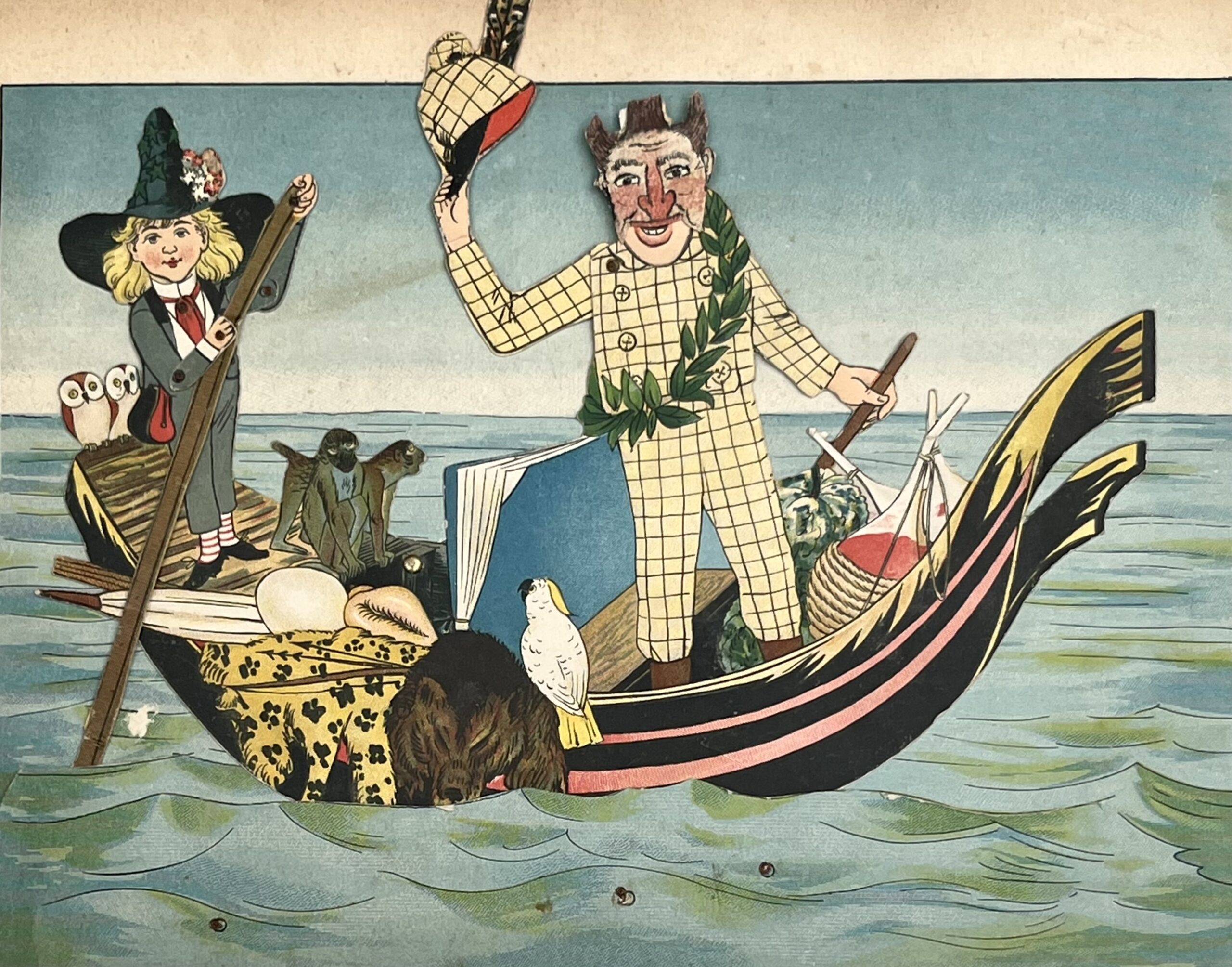 Landscape folio; publisher’s original red cloth-backed chromolithographed pictorial boards; [18]; with introductory leaf and 8 glorious full-page colour-printed plates, each with several movable components operated by pull-tabs to the fore-edge; externally dust-soiled and rubbed with some marks, fading to spine cloth, bruising to head, and fraying to tail, with a 4cm split to cloth at heel of lower joint and shelf-wear to edges and corners; internally very good and sound throughout with all mechanical plates in working order, with some expert attention paid to inner gutters which are neatly reinforced, to one lower text margin which has later reinforcement to lower edge, to tabs (one of which is worn and one sympathetically replaced), and to the living pictures which show minimal skilled intervention with one or two wire rivets cleverly replaced, one short tear repaired to the serpent’s tail, and the small face of the servant Damian sympathetically replaced in facsimile to final image; a very scarce survival in this condition.