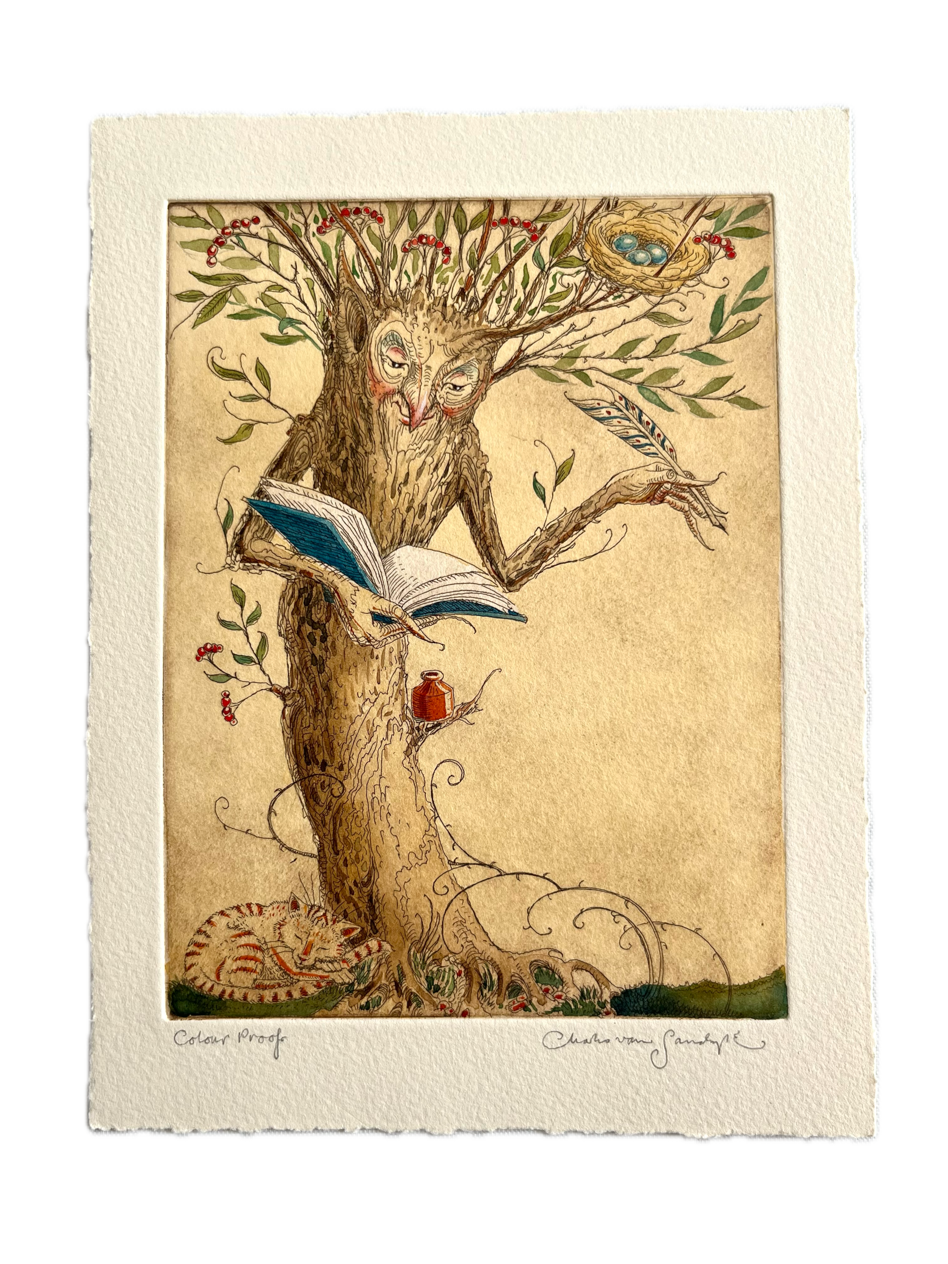A charming original copperplate etching on handmade ivory artist’s card with untrimmed edges (card size 145 x 190mm; image size 110 x 150mm) depicting an anthropomorphic tree with human features and branches as arms holding an open book and quill pen, with inkwell balanced on a twig, and a striped cat curled asleep at its base, beautifully handcoloured by the artist, with “Colour Proof” in the artist’s hand, and the artist’s signature, both in pencil, to the lower margin; in fine condition.