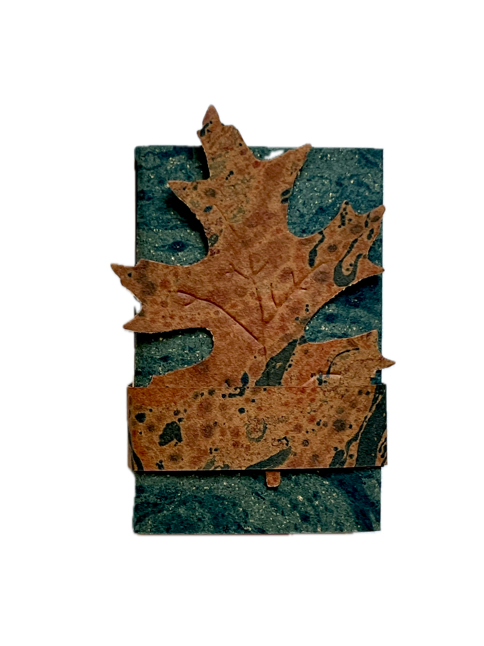 A miniature accordion-folded book bound in hand-marbled card covers speckled with gold with onlaid printed paper title to spine, 60mm x 40mm; pp. 9 extending as a printed panorama in sepia featuring a collection of illustrations of tiny magical creatures; closed with a paper band accompanied by a leaf cut-out of marbled paper, embossed with veins, signed by the artist; vanishingly scarce.
